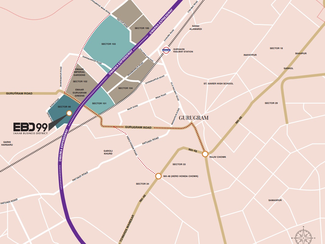 Located in Sector 99, along the Dwarka Expressway, EBD 99 benefits from excellent connectivity to Delhi and key business zones. The surrounding area is rapidly evolving into a premium residential and commercial micro-market, ensuring consistent footfall and business growth.