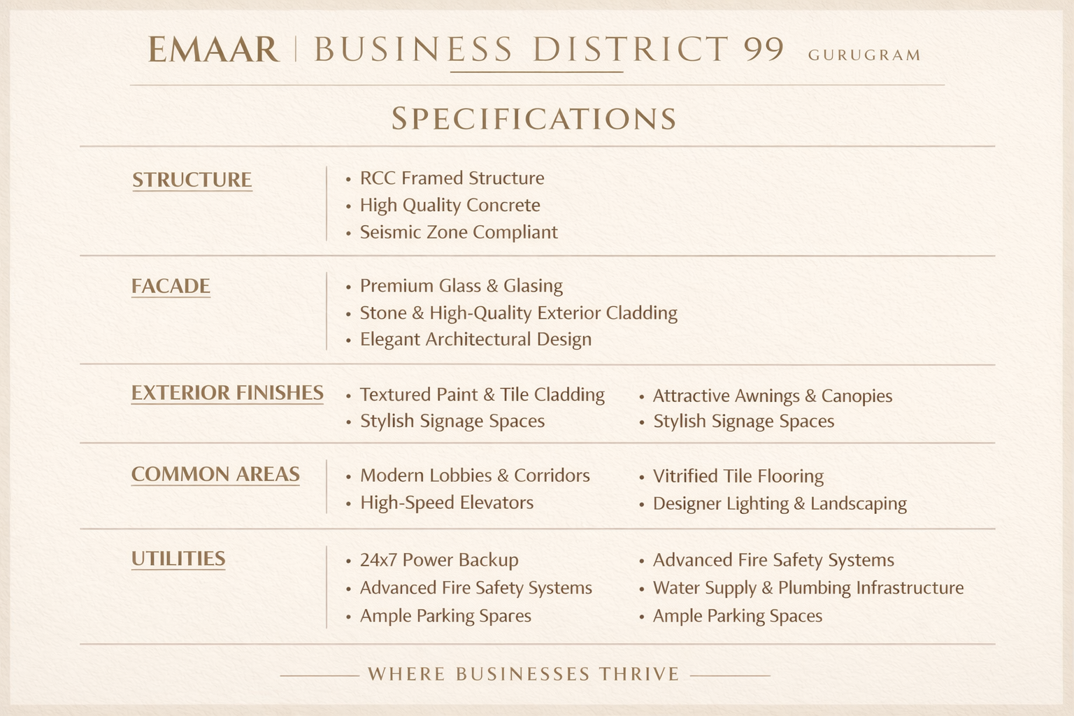 Discover a landmark commercial destination at Emaar Business District 99, Gurugram, where luxury retail meets strategic investment potential. Developed by Emaar India, this project is crafted to redefine high-street retail and SCO (Shop-Cum-Office) spaces in one of Gurugram’s fastest-growing corridors.